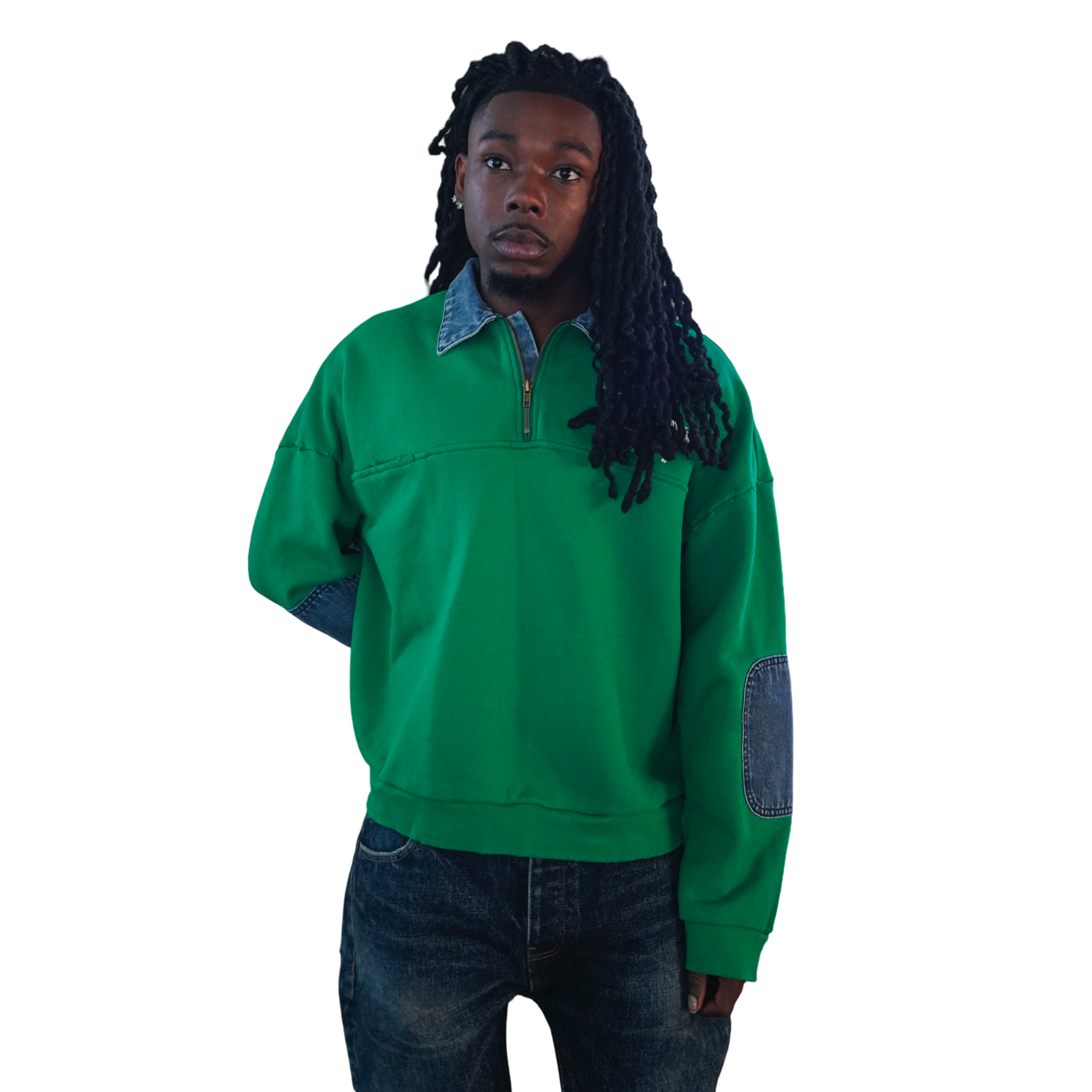 long sleeve quarter zip sweatshirt featuring a blue denim collar, denim elbow patches, an invisible front pocket along the chest seam and an embroidered twin sagittarius emblem
